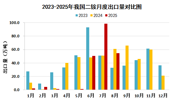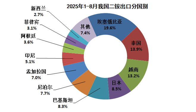 2025年1-8月,我國(guó)二銨主要出口埃塞俄比亞(41.8萬(wàn)噸)、泰國(guó)(29.5萬(wàn)噸)、越南(28.1萬(wàn)噸)、日本(18.1萬(wàn)噸)、巴基斯坦(17.7萬(wàn)噸)、,向這五個(gè)國(guó)家的出口量占到總出口量的63.5%。