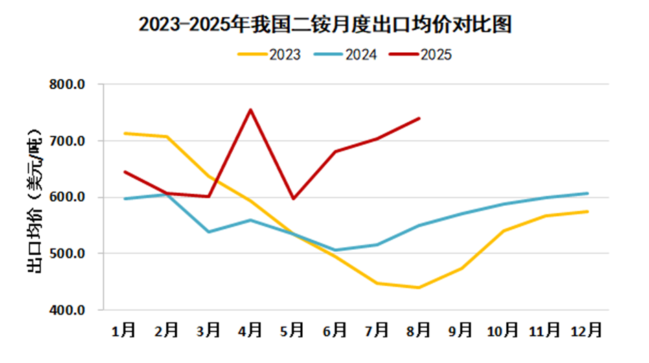 8月份二銨出口54.5萬(wàn)噸,同比下降10.2%,環(huán)比下降44.6%;平均出口價(jià)格739.0美元/噸,同比增長(zhǎng)35.7%,環(huán)比增長(zhǎng)5.0%。
