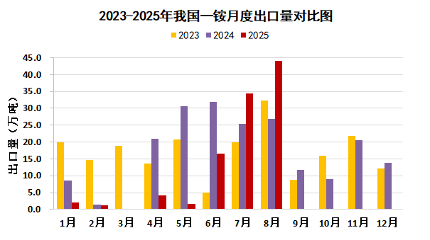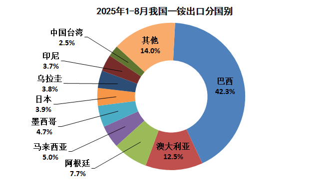 2025年1-8月,我國(guó)一銨主要出口巴西(44.0萬(wàn)噸)、澳大利亞(13.0萬(wàn)噸)、阿根廷(8.0萬(wàn)噸),向這三個(gè)國(guó)家的出口量占到總出口量的62.5%。