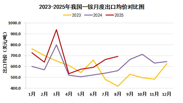 8月份一銨出口44.1萬(wàn)噸,同比增長(zhǎng)64.4%,環(huán)比增長(zhǎng)28.1%;平均出口價(jià)格693.5美元/噸,同比增長(zhǎng)23.7%,環(huán)比增長(zhǎng)4.1%。